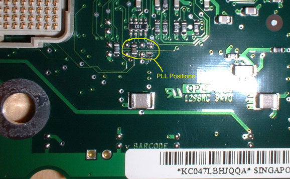-5- Figure out which speed you wish to try. Initially, I'd go for 50MHz higher than the original CPU speed (note that some CPUs will refuse to operate here, see -6- in this case). That's the safest way, because you can detect any possible heat issues before it's too late, though under normal circumstances the huge heat sink will do the trick. Check the PLL config for the desired setting in the table above. Note that a "o" means that there should be a resistor or any other kind of connection on that particular position and the value "X" means no connection at all: |
